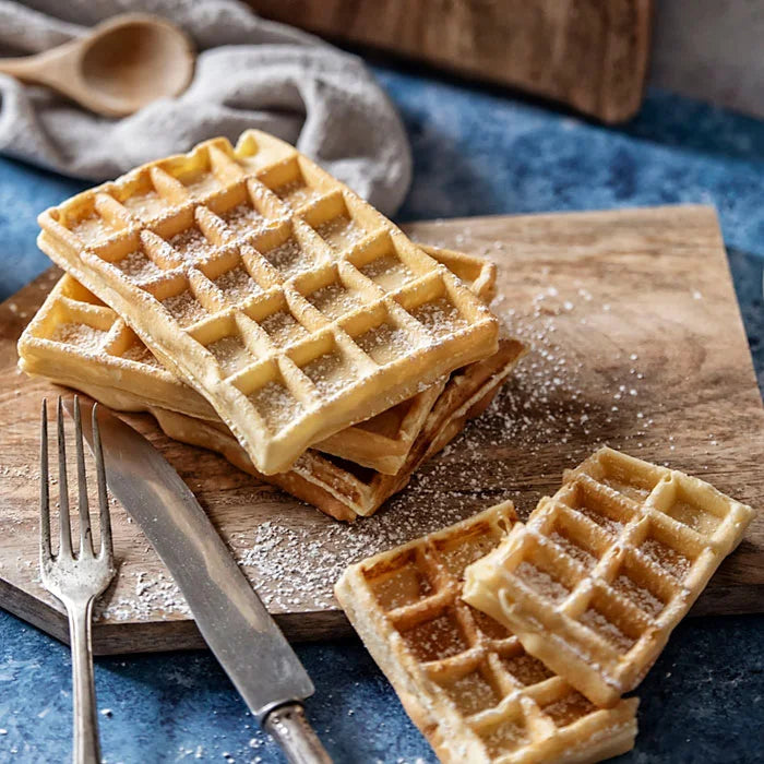 Waffeleisen füllen und Wafflen ausbacken. Die Füllmenge und Backzeit variiert je nach Form und Größe der Backplatten.